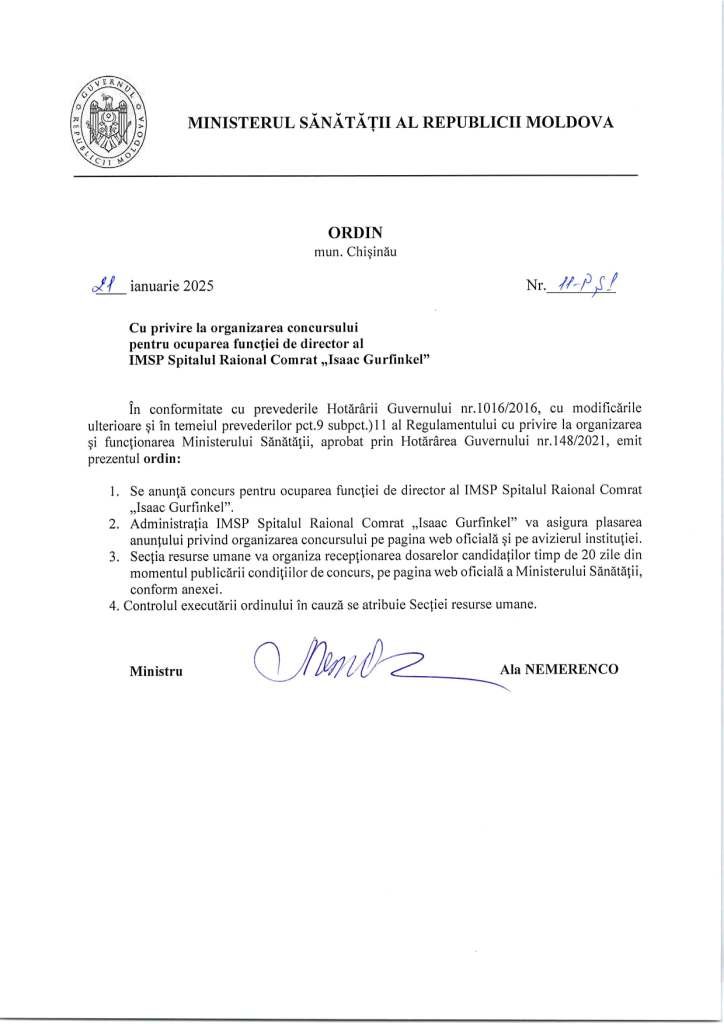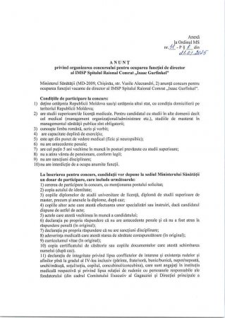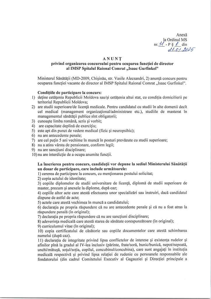 Внимание конкурс! Сu privire la оrgапizаrеа concursuIui репtru осuраrеа func{iei de director al IMSP Spitalul Raional Comrat,,Isaac Gurfinkel"